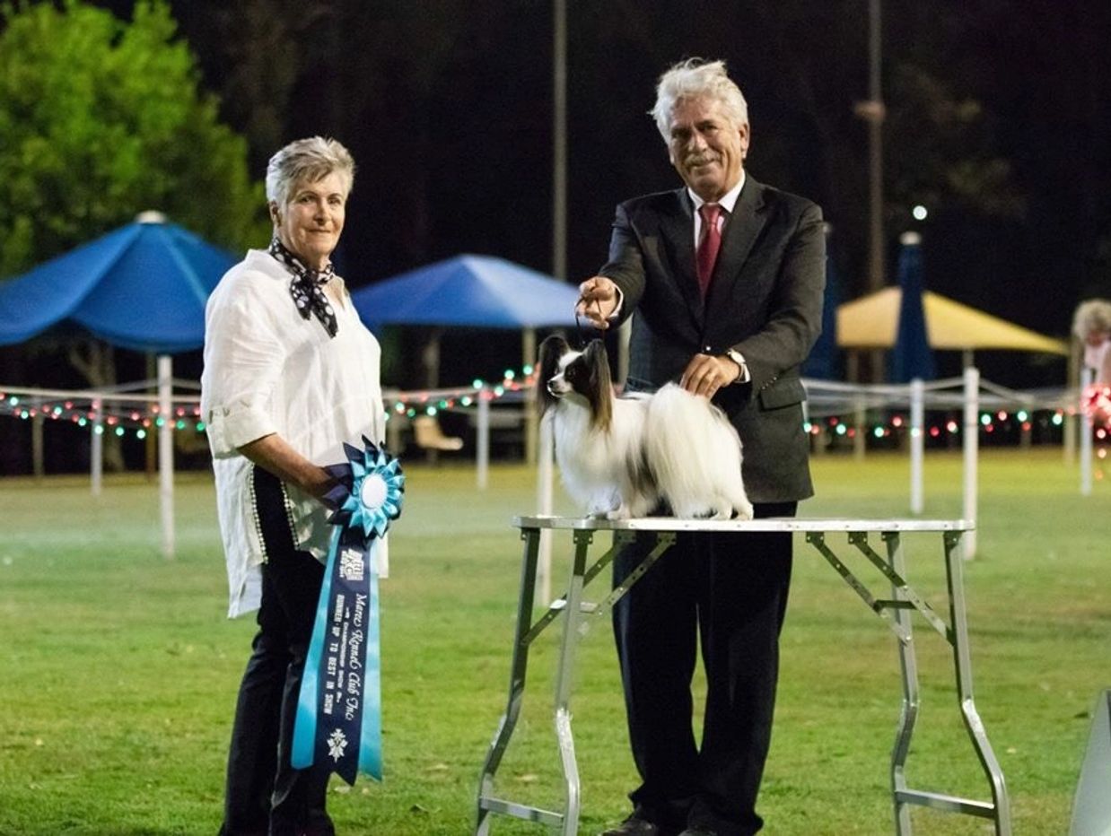 One very memorable win was at The Papillon (Dog) Club of NSW Inc 100th Championship Show when Rio won the Dog Challenge and Runner Up Best Exhibit in Specialty Show from the Junior Dog class! Only 2 weeks out of quarantine!